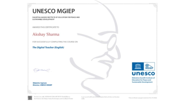 आज का युग सूचना प्रौद्योगिकी का है जहाँ हर विद्यार्थी डिजिटल उपकरणों से घिरा हुआ है। ऐसे में एक शिक्षक का डिजिटल रूप से साक्षर होना अनिवार्य है। अक्षय शर्मा ने यूनेस्को से डिजिटल टीचर सर्टिफिकेट प्राप्त कर यह सिद्ध कर दिया है कि भविष्य की कक्षाएं अधिक संवादात्मक और प्रभावी होने वाली हैं।