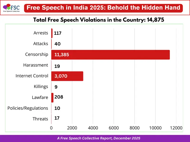 भारतीय मीडिया के इतिहास में साल 2025 को एक 'खूनी अध्याय' के रूप में याद किया जाएगा। फ्री स्पीच कलेक्टिव (FSC) की ताज़ा रिपोर्ट ने उन दावों की पोल खोल दी है जिनमें प्रेस की आज़ादी सुरक्षित होने की बात कही जाती थी। जाते-जाते यह साल पीछे नौ पत्रकारों की लाशें और तैंतीस घायल पत्रकारों का लहू छोड़ गया है। रिपोर्ट के डराने वाले आंकड़े बताते हैं कि पूरे साल देश में अभिव्यक्ति की स्वतंत्रता के लगभग पंद्रह हजार उल्लंघन दर्ज किए गए। यह महज़ आंकड़े नहीं बल्कि उस खौफनाक हकीकत का आइना हैं जहाँ सच की आवाज़ को लाठी, गोली और कानूनी शिकंजे के दम पर दबाने की हर मुमकिन कोशिश की गई।